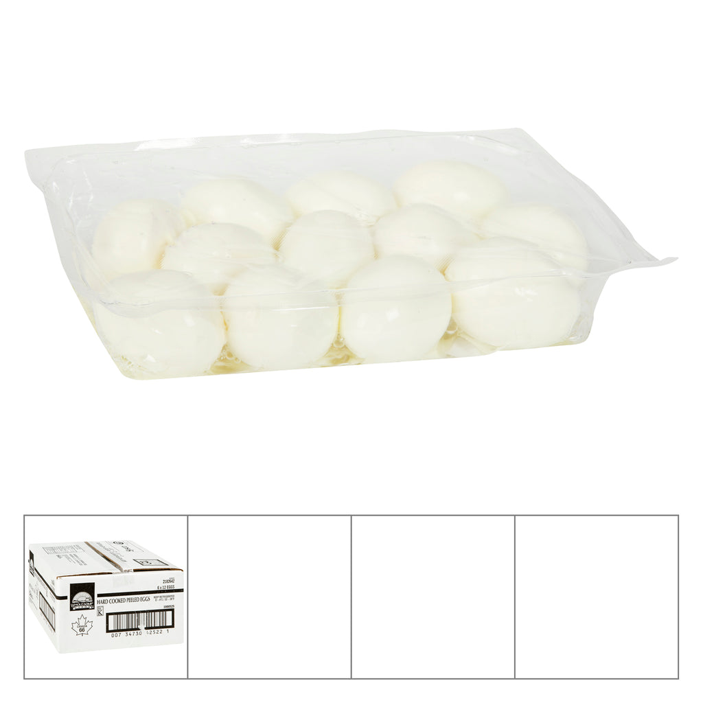 Grade A farm fresh eggs, peeled, cooked and packed in pillow packs. Case contains 6 individually packed dozen of eggs. Note: Ready to serve.