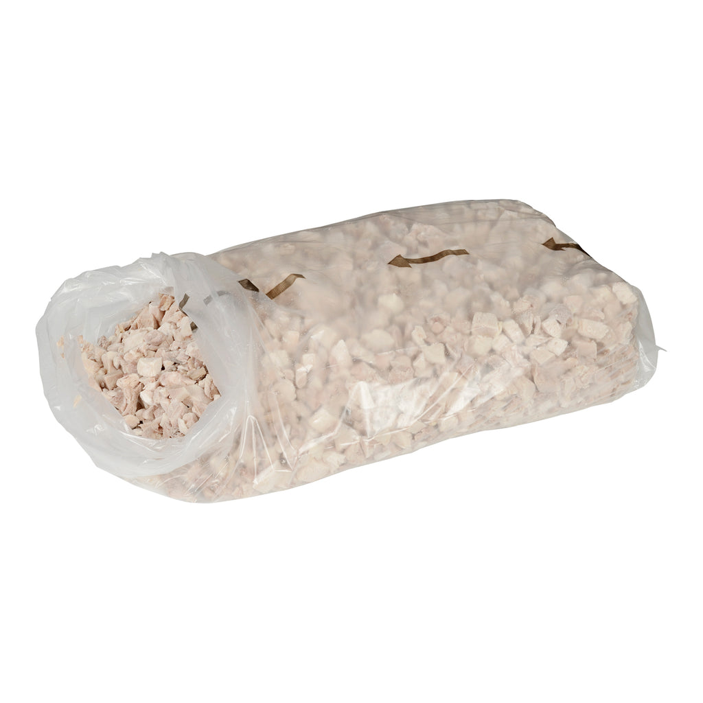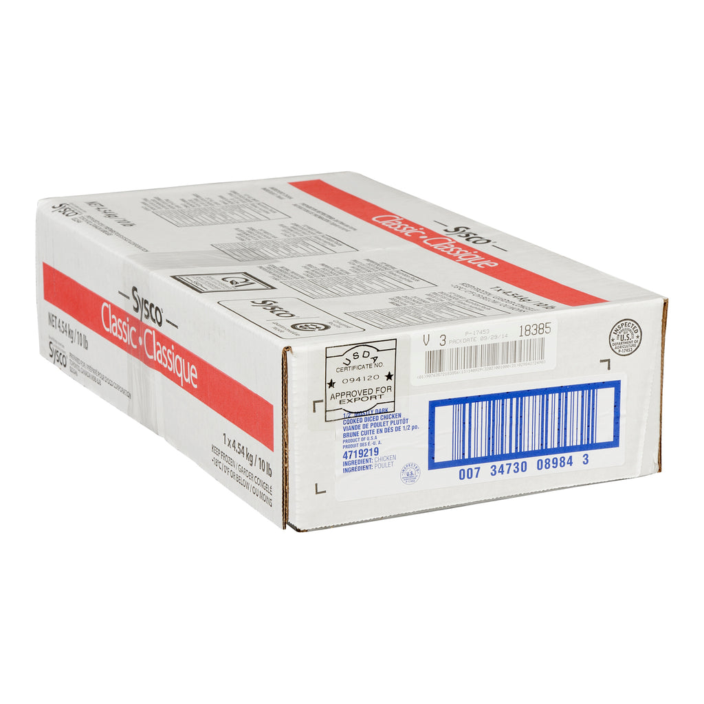 Sysco Classic Fully Cooked Diced Chicken 1/2" Mostly Dark, using Cooked Diced Chicken guarantees exact portioning and reduces preparation time. The only ingredient in our fully cooked chicken is the chicken itself. Note: Thaw and use or warm from frozen