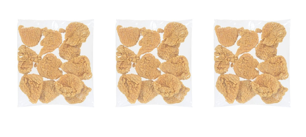 Chicken breasts, Water, Wheat flour, Soya, and/or Canola oil, Soy protein isolate, Modified corn starch, Whole grain wheat flour, Salt, Yellow corn flour, Wheat gluten, Baking powder, Spices, Onion powder, Garlic powder, Flavour, Potassium chloride, Modified palm oil, Defatted soy flour, Celery seeds, Guar gum, Spice extractives. Contains: Soy, Wheat. May contain: Milk, Eggs