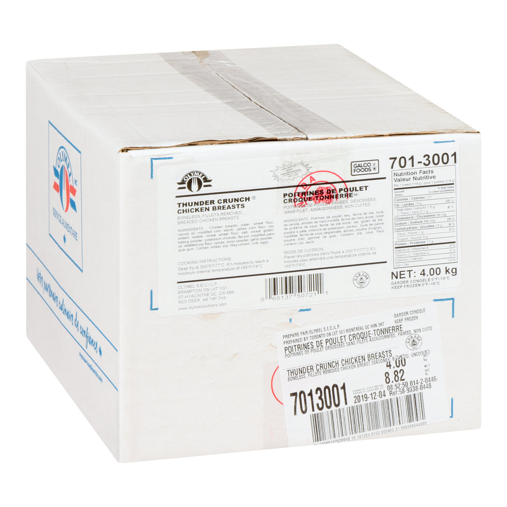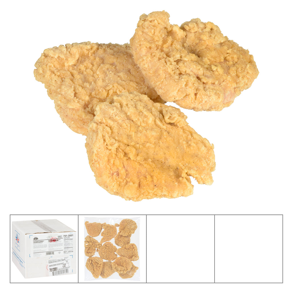 Chicken breasts, Water, Wheat flour, Soya, and/or Canola oil, Soy protein isolate, Modified corn starch, Whole grain wheat flour, Salt, Yellow corn flour, Wheat gluten, Baking powder, Spices, Onion powder, Garlic powder, Flavour, Potassium chloride, Modified palm oil, Defatted soy flour, Celery seeds, Guar gum, Spice extractives. Contains: Soy, Wheat. May contain: Milk, Eggs
